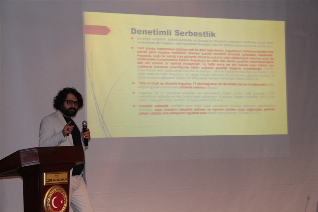 Konferansta konuşan Cizre Kaymakamı Ahmet Vezir Baycar, adalet sisteminin temel amacının cezalandırmadan çok rehabilitasyonu esas aldığını ifade etti. Kamu huzurunu destekleyen çalışmaların sürdürüldüğünü belirten Kaymakam Baycar, denetimli serbestlik uygulamalarının toplumsal uyum sürecine önemli katkılar sunduğunu dile getirdi. Akademisyenler tarafından denetimli serbestlik, bağımlılık ve ceza sonrası sosyal uyum konularında sunumlar yapılarak katılımcılar bilgilendirildi.