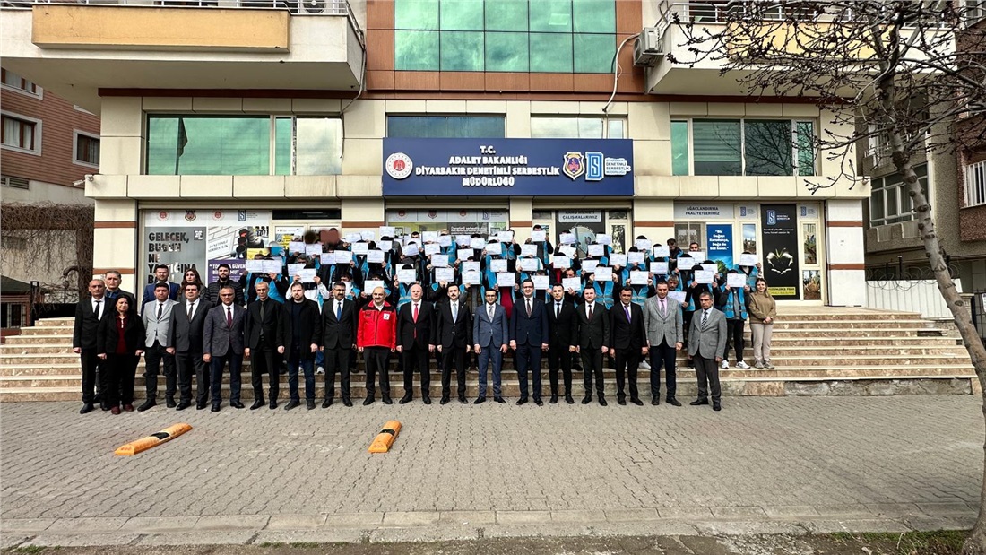 Müdürlük fuaye alanında düzenlenen törende, Millî Eğitim Bakanlığı onaylı belgeler yükümlülere takdim edilirken, Türk Kızılay Diyarbakır Şubesi tarafından ihtiyaç sahibi yükümlülere market alışveriş kartı desteği sağlandı. Törene Diyarbakır Başsavcı Vekili Özgür Celbek, Cumhuriyet Savcısı Hüseyin Özcan, İl Millî Eğitim Müdürü Salih Sadoğlu, Yenişehir İlçe Millî Eğitim Müdürü Hüsamettin Atlı, Yenişehir Halk Eğitim Merkezi Müdürü Nuray Hurata, Kızılay Şube Başkanı Ahmet Demirel, Denetimli Serbestlik Müdürü Sinan Yaşar, kurum personeli ve yükümlüler katıldı. Programda yapılan konuşmalarda eğitim, kamu hizmeti ve sosyal destek çalışmalarının onarıcı adalet anlayışını güçlendirdiği vurgulanarak paydaş kurumlara teşekkür edildi.