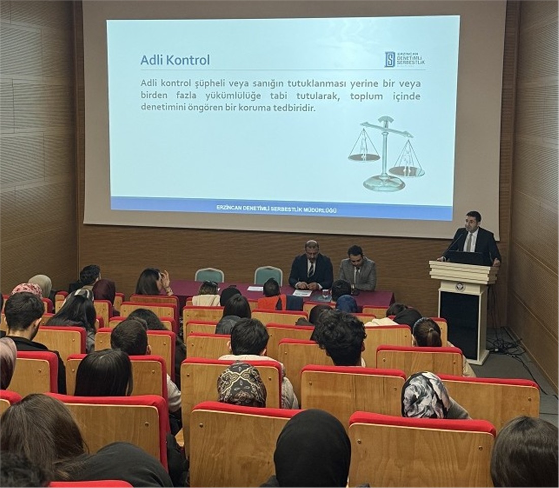 Aynı iş birliği çerçevesinde, denetimli serbestlik sisteminin tanıtımına yönelik olarak üniversite öğrencilerine yönelik bir seminer programı düzenlendi. Sosyal hizmet bölümü ile Erzincan Denetimli Serbestlik Müdürlüğü tarafından ortaklaşa gerçekleştirilen seminerde, denetimli serbestlik sisteminin gelişim süreci, uygulama alanları ve topluma sağladığı katkılar ele alındı. Programda, sistemin cezalandırıcı adalet anlayışından onarıcı adalet yaklaşımına geçişteki rolü vurgulanarak, yükümlülerin sosyal hayatla bağlarını koparmadan rehabilite edilmesinin önemi üzerinde duruldu.