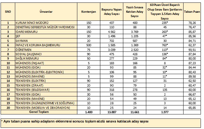 Görevde Yükselme ve Ünvan Değişikliği Yazılı Sınavında altmış (60) ve üzerinde puan almasına karşın belirlenen kontenjanın bir buçuk katı kadar adaydan müteşekkil başarı listesinde yer almayan, Ceza ve Tevkifevleri Genel Müdürlüğü Personeli Görevde Yükselme ve Ünvan Değişikliği Yönetmeliği’nin ilgili maddelerine göre atanacak adaylarda aranan genel ve özel şartları sağlamadığı tespit edilen adaylar ise sözlü sınava çağrılmaya hak kazanamamıştır.