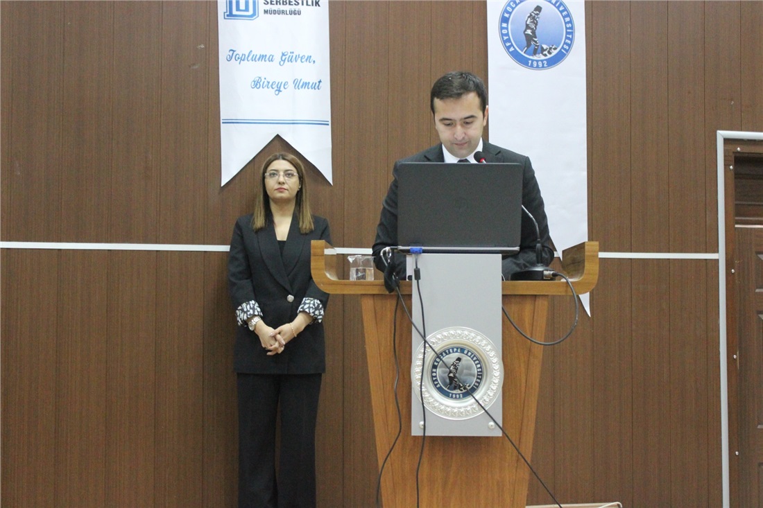Konferans, Bolvadin Cumhuriyet Başsavcısı Ümit Güntürk’ün açılış konuşmasıyla başladı. Konuşmasında denetimli serbestliğin çağdaş infaz sistemi içerisindeki rolüne, toplum güvenliğinin sağlanmasına sunduğu katkılara ve üniversitelerle yürütülecek iş birliklerinin önemine değindi. Ardından Denetimli Serbestlik Memuru Leyla Şahin tarafından gerçekleştirilen sunumda; denetimli serbestlik süreçleri, rehberlik ve iyileştirme faaliyetleri, yükümlülere yönelik programlar, elektronik kelepçe uygulamaları ile kurumun topluma kazandırma misyonu hakkında bilgilendirme yapıldı.