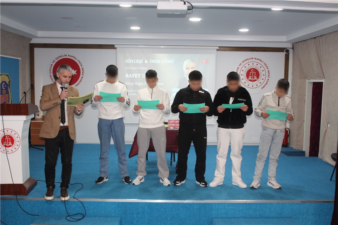 Konuşmaların ardından katkılarından dolayı Sayın Rafet Ural’a hediyeleri, kitap bağış kampanyasına destek veren kurum personeline ise teşekkür belgeleri Kurum Müdür Vekilimiz Fatih Yıldız tarafından takdim edildi. Söyleşi sonunda kurum kütüphanesinde düzenlenen imza gününde Sayın Ural’a ait imzalı yayınlar çocuklara hediye edildi. Kurum olarak, Rafet Ural’a gösterdiği destek ve hassasiyetlerinden dolayı teşekkür ederiz.