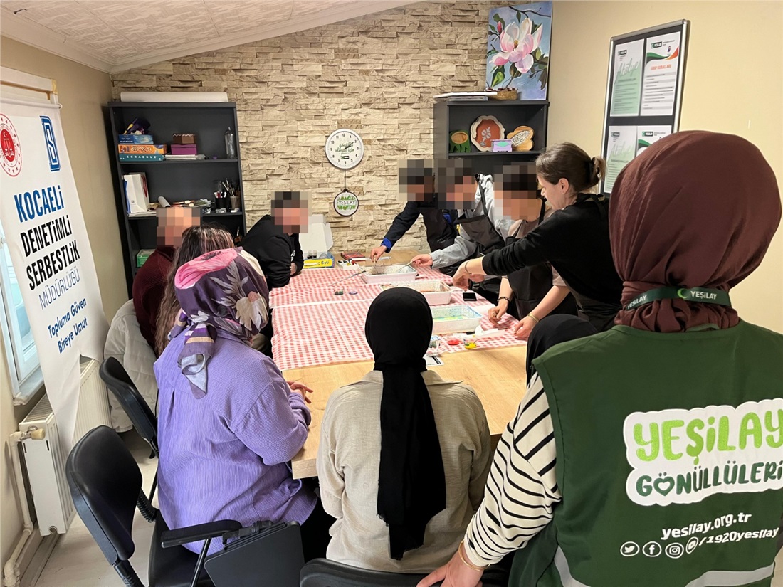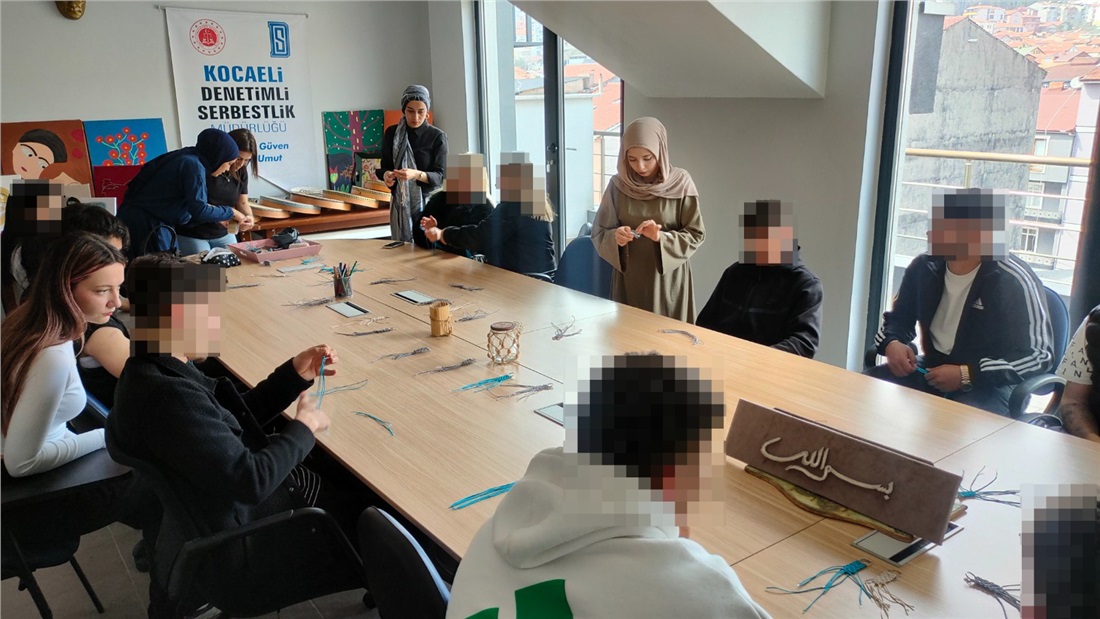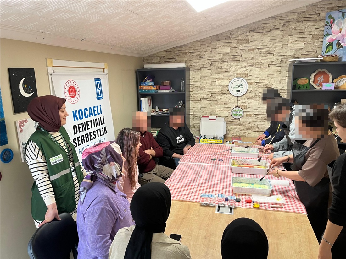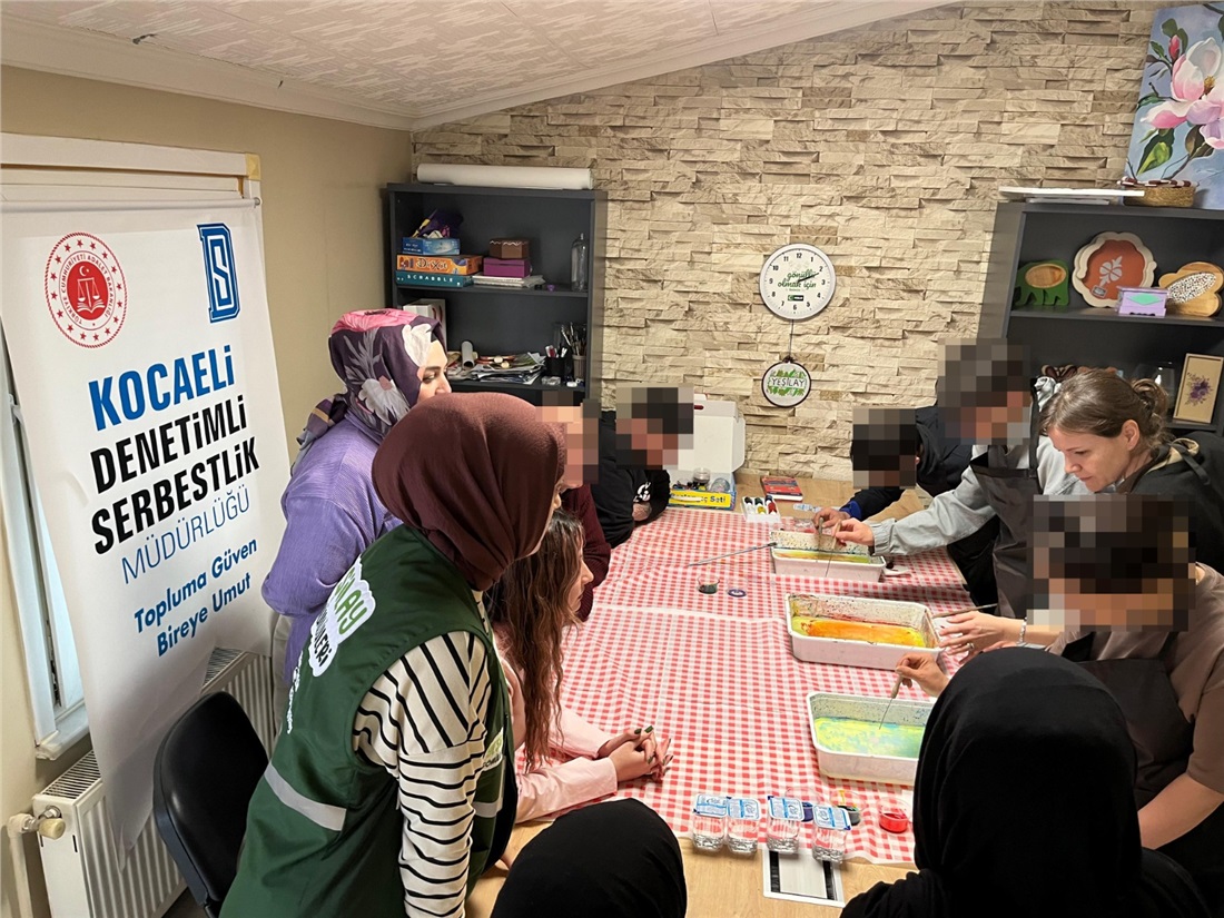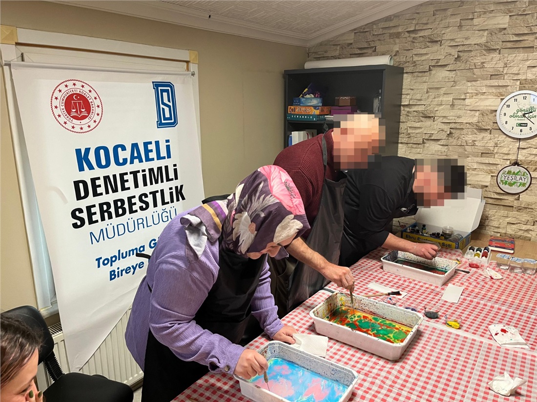 Aynı kapsamda yükümlülere yönelik ebru sanatı eğitimi düzenlendi. Kocaeli Yeşilay Şube Başkanlığı ve Yeşilay Danışmanlık Merkezi iş birliğiyle gerçekleştirilen programda YEDAM hizmetleri tanıtıldı ve bağımlılık konusunda bilgilendirme yapıldı. Ardından ebru sanatının teorik ve uygulamalı eğitimi verildi. Yükümlüler etkinliğe katılarak sanatsal çalışmalar yaptı. Denetimli serbestlik personeli süreci takip etti ve çalışmaların düzenli yürütülmesinde görev aldı. Gerçekleştirilen faaliyetler, yükümlülerin topluma uyum sürecine ve sosyal gelişimlerine katkı sağladı.