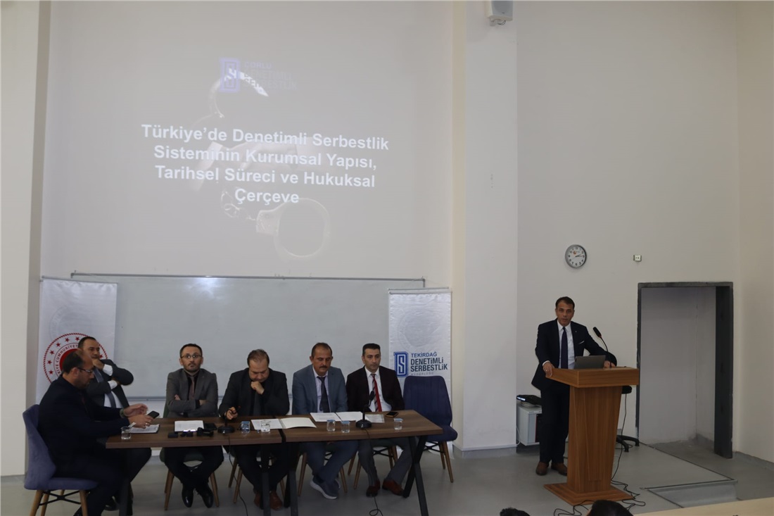 Tekirdağ ve Çorlu Denetimli Serbestlik Müdürlükleri ile Tekirdağ Namık Kemal Üniversitesi iş birliğinde “Türkiye’de 20. Yılında Denetimli Serbestlik Uygulamaları” konulu panel gerçekleştirildi. Namık Kemal Üniversitesi Hukuk Fakültesinde düzenlenen programa Tekirdağ Cumhuriyet Başsavcı V. Mustafa Deren Özkol, Namık Kemal Üniversitesi Rektör Yardımcısı Prof. Dr. Murat Taşan, Tekirdağ Cumhuriyet Savcısı Hasan Can Özdiş, Hukuk Fakültesi Dekanı Prof. Dr. Selman Karakul, Tekirdağ Denetimli Serbestlik Müdürü Ahmet Güneyli, Çorlu Denetimli Serbestlik Müdürü Mehmet Ali Kara, akademisyenler, denetimli serbestlik personeli ve öğrenciler katıldı.
